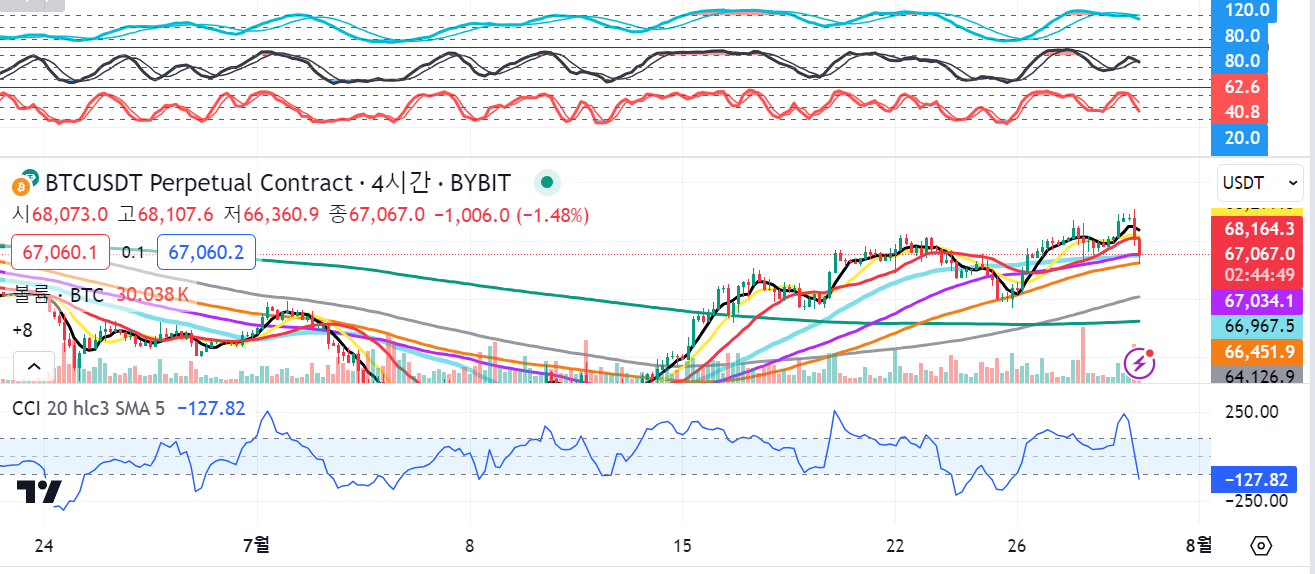 오늘은 7.30 02:00 기준으로 비트코인의 차트를 1시간봉, 4시간봉, 일봉 위주로 살펴보겠습니다.